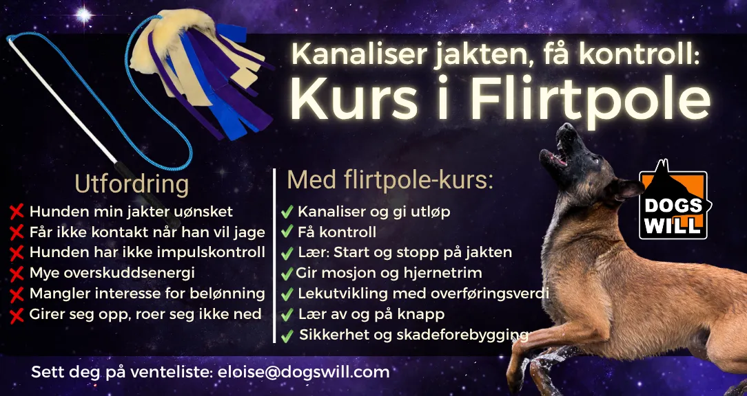 Etter endt kurs skal du kunne bruke flirtpole på en trygg og sikker måte. Du har lært hvordan du kan legge opp treningen med flirtpole gradvis og lagvis. Når du har jobbet deg gjennom systemet i tiden etter kurset, vil du kunne ha mye bedre kontroll på hunden når den er i jaktmodus. Lydigheten og samarbeidet med hunden vil bli tatt opp til et nytt nivå. Du har også oppdaget en måte å trene hunden på med høy intensitet som er både fysisk og mentalt stimulerende.
